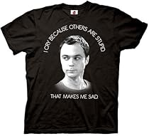 This T-shirt feature teh Estemmed Dr. Sheldon Cooper with the quote I cry because people are stupid and that makes me sad." Share his sympathy with this awesome Big Bang Theory T-shirt."