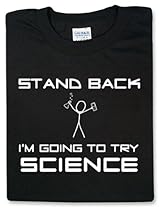 "Stand back! I'm going to try science!" with a little figure holding out a flask and a calculator in white on the front of this black 100% cotton t-shirt.